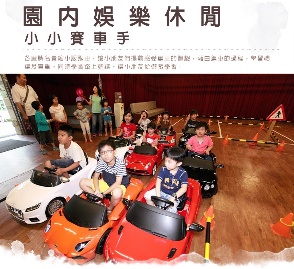 園區內有充滿療癒力的多肉植物,沙坑、攀岩區、鞦韆滑梯等各項兒童設施, 還有麝香豬、鸚鵡、白天鵝、喜樂蒂、巨型貴賓、豹貓...等可愛動物提供觀賞與互動,讓孩子們藉由互動中瞭解如何愛護與認識動、植物。