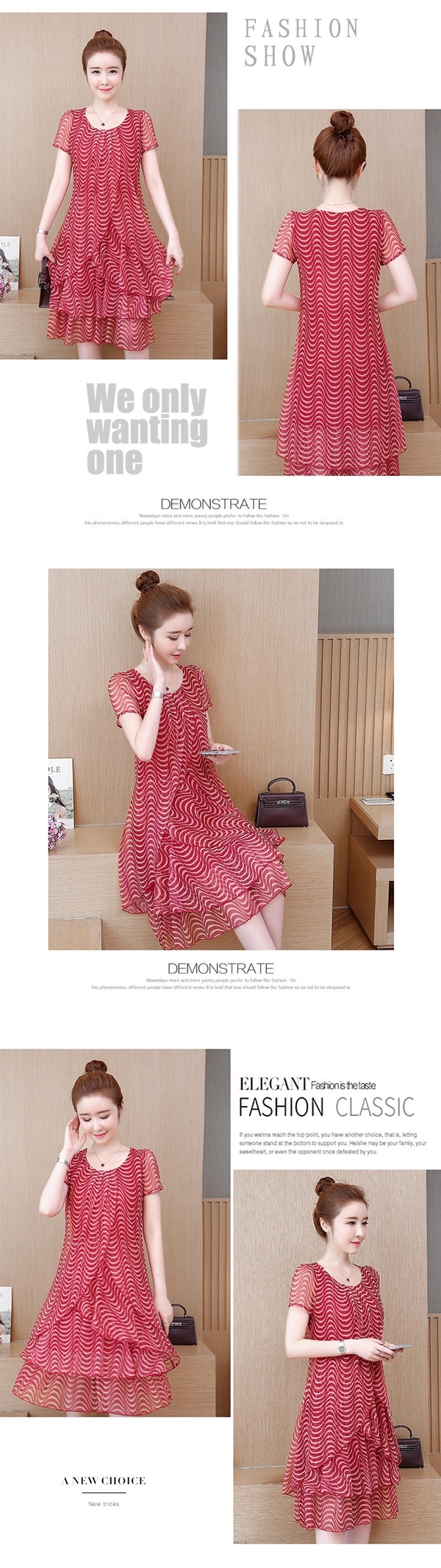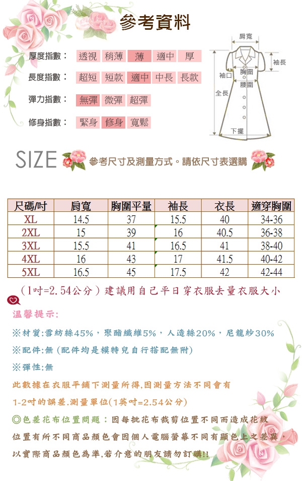 商品規格 品牌定位 : 流行時尚 品牌 : K.W. 款式 : 洋裝 適穿性別 : 女生 尺寸 : XL, XXL, XXXL, XXXXL, XXXXXL 袖長 : 短袖 褲長/裙長 : 膝上 主材質 : 尼龍 材質說明 : ☆材質:雪紡絲45%,聚酯纖維5%,人造絲20%,尼龍紗30% 配件 : ☆配件:無 (配件均是模特兒自行搭配無附) 適穿季節 : 春夏 顏色 : 黑色系, 紅色系 流行元素 : 條紋 洗滌方式 : ☆洗滌方式:請避免使用烘衣機烘乾,請勿使用含有漂白溶劑的洗劑 切勿使用快速及強力清潔功能之洗衣粉或冷洗精,建議深色與淺色衣物分開洗滌 產地 : 韓國 品牌國家 : 丹麥 備註 : 產品內容: ☆材質:雪紡絲45%,聚酯纖維5%,人造絲20%,尼龍紗30% ☆單位:英吋 (1吋=2.54公分) ☆尺寸: XL、2XL、3XL、4XL、5XL ☆顏色:紅色、黑色 ☆彈性:無 ☆產地:韓國 ☆配件:無 (配件均是模特兒自行搭配無附) ☆洗滌方式:請避免使用烘衣機烘乾,請勿使用含有漂白溶劑的洗劑 切勿使用快速及強力清潔功能之洗衣粉或冷洗精,建議深色與淺色衣物分開洗滌體驗說明 使用方法說明 ◎ 正常穿脫 商品顏色會因個人電腦螢幕不同有顯色上之差異,以實際商品顏色為準,請見諒。若介意的朋友請勿訂購!!注意事項 01.送達地點有否限制:無 02.銷售注意事項: 注意!!此商品為預購款!訂單成立後須等7-14天的工作天後,陸續安排出貨,謝謝。!! ◎ 色差花布位置問題:因每批花布裁剪位置不同而造成花紋位置有所不同,商品顏色會因個人電腦螢幕不同有顯色上之差異,以實際商品顏色為準,請見諒。若介意的朋友請勿訂購!! ◎ 退貨限制: 1.請消費者收到商品後先行試穿,符合尺寸後才將吊牌剪下,如有下水或污損和商品短缺香水味,恕不退貨 2.辦理商品退換貨時,商品如有贈品或配件,麻煩請一併寄回,否則視同缺件無法受理喔! 3.若有領標或吊牌與透明袋之商品,一經拆剪或損壞,則視同缺件,無法受理退換貨唷! 4.超過鑑賞期10天,無法辦理退貨 ◎ 洗滌方法: 1.深色衣服和淺色衣服請分開洗!建議您可以加用洗衣袋,並將洗衣機速度調整為柔洗!洗滌前請確認洗衣精不含漂白成份,以免褪染色! 2.請反面輕手洗,以確保衣物長效性。 3.第一次收到商品請先分開用手洗滌,將多於色粉清洗掉,方可正常洗滌。 4.未避免衣物退色,勿長時間浸泡或使用漂白水 5.翻面包洗衣網可加強避免起毛球。 ◎ 紡品:溫馨提醒您,本商品如有汙損、水洗或有領標、吊牌拆剪或損毀之情形,將無法退換,敬請見諒。詳細商品說明
