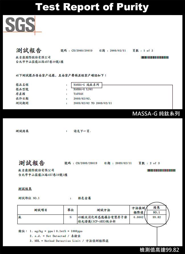 秘密戒鍊 雙重功能 加倍愛戀 現在買還贈送白鋼項鍊,戒指還可以成為項鍊 【檢測報告書】─鈦材質純度檢測報告 究竟眾多不同的檢測報告在報告的是什麼呢? SGS所提供的為材質檢測報告書, 然而究竟是哪部分材質的檢測報告 就得靠消費者用雪亮的眼睛細細觀察了! MASSA-G提供鈦飾材質之純度報告並非一般磁石純度報告! 而其高達99.82之檢測值已為一般所稱「純鈦」標準, MASSA-G最頂級的時尚健康美學體驗用數字告訴您! 驗證SGS REPORT是否為真注意幾項: 檢測日期是否較出報告日期為前 首頁是否有SGS人員簽名 報告號碼與頁次是否完整正確