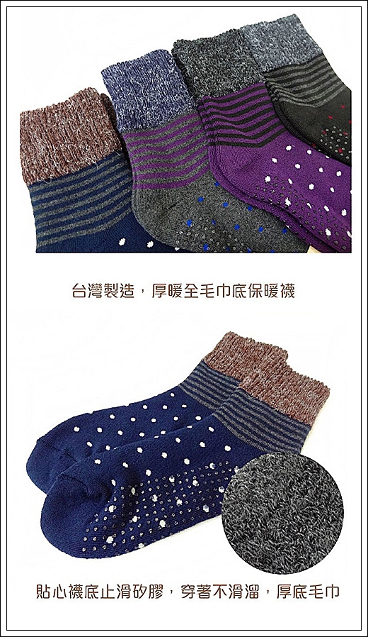 ● 短統保暖禦寒全毛巾厚底點點止滑毛襪。 ● 保暖禦寒, 冬季抗寒必備。 ● 腳底止滑設計,穿著更安全。 ● 柔軟舒適好穿。 ● 經濟超值款,花小錢即可適度保暖,陪您度過舒適的冬天。 ● 長輩居家保暖防護適宜選擇。