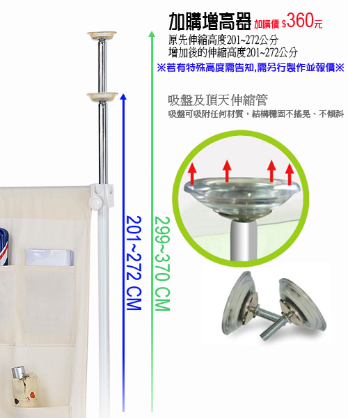2. 可加購頂天增高器,克服天花板過高的地形,原伸縮高度為201~272公分,加購後伸縮的高度為299~370公分。 (※若有特殊高度需告知,需另行製作並報價)。