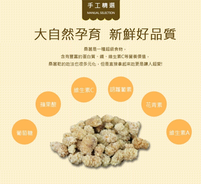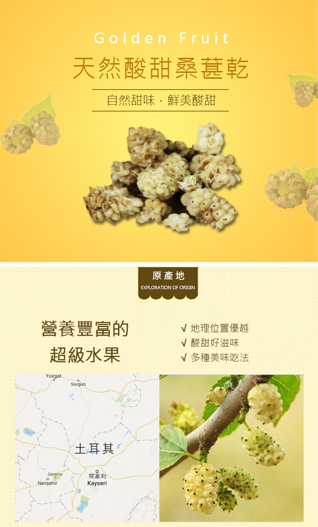 更香甜的白桑葚製作 來自果乾大國土耳其原裝進口 營養豐富的超級水果乾 人工挑選的好品質 清香甜美的口感 品牌 無品牌國家 台灣類型 蔬果乾種類 水果乾葷 售價:2299