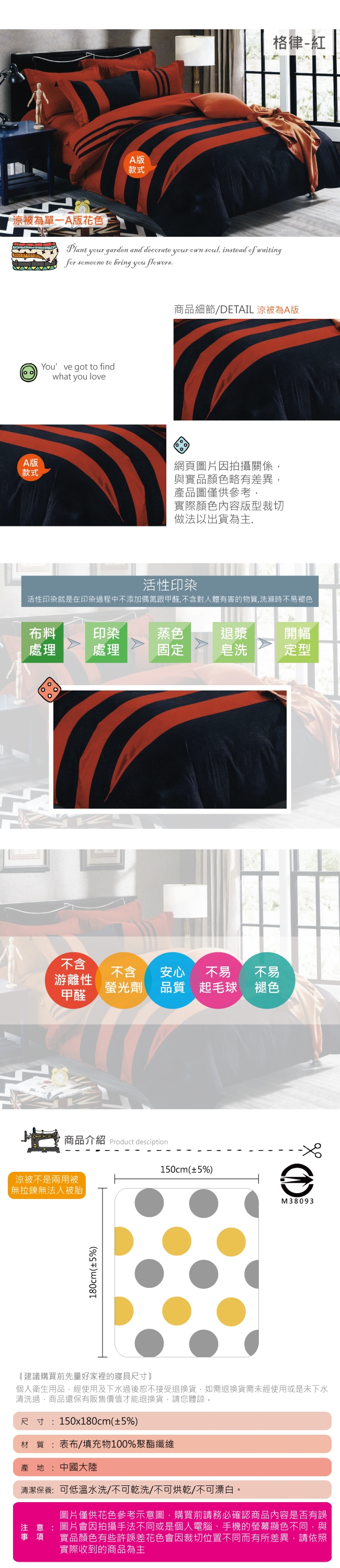 商品規格 種類 : 涼被/四季被 類型 : 聚酯纖維 規格 : 單人(3.5尺) 件數 : 1 尺寸 : 150x180cm(±5%)X1 產地 : 中國 體驗說明 使用方法說明 清潔保養方式:可低溫水洗/不可乾洗/不可烘乾/不可漂白。 注意事項 網頁圖片僅為示意圖參考,不含拍攝道具,實際出貨件數以「商品內容」說明為主。 網頁圖片因拍攝關係,與實品顏色略有差異,產品圖僅供參考,實際顏色內容版型裁切做法以出貨為主。 產品圖僅供參考,實際內容做法以出貨為主。