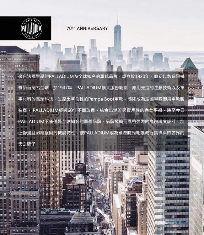 Palladium 2016年春夏推出全新2.0進化系列,以創新的鞋底結構推出Pallaville鞋款 設計概念來自近年來廣受之「Urban Outdoor」時尚風格,講求機能性外觀兼具的鞋款要求 以「Sneaker Boots」全新形象席捲全球Pallaville進化系列將經典靴型大改造,創造出流線型的外觀 鞋面採用各式不同強度的帆布,搭配全新Palladium 2.0鞋底,帶來更佳的穿著感受 嶄新外形讓你不被長靴受限,任意搭配牛仔褲或短裙都十分合襯,讓活力春夏的城市探索無拘無束 #160;