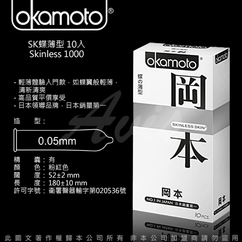 品名:Okamoto岡本 Skinless Skin 蝶薄型保險套(10入裝)