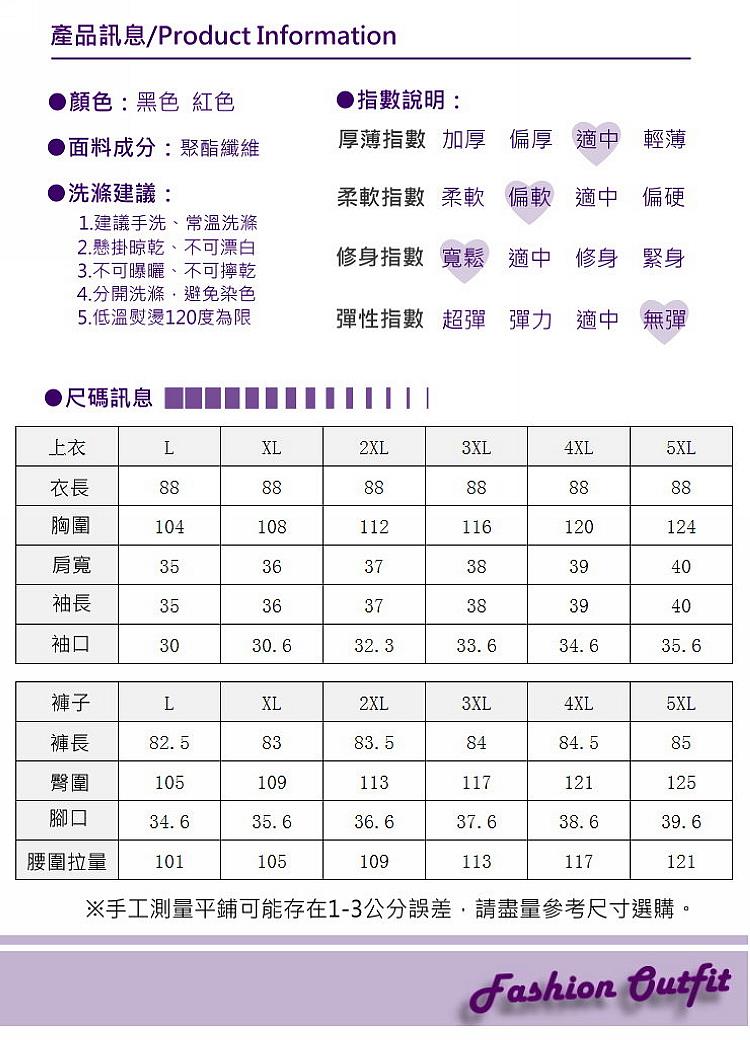商品規格 品牌定位 : 流行時尚 品牌 : REKO 款式 : 套裝 適穿性別 : 女生 尺寸 : L, XL, XXL, XXXL, XXXXL, XXXXXL 袖長 : 七分 褲長/裙長 : 過膝 主材質 : 聚酯纖維 適穿季節 : 春夏 顏色 : 黑色系, 紅色系 體驗說明 使用方法說明 無 注意事項 ※森森、東森百貨商品一律提供消費者10天審閱期 ※ 【辦理商品退換貨時,商品如有贈品或配件,麻煩請一併寄回,否則視同缺件無法受理喔!】 ※商品圖檔顏色因電腦螢幕設定差異會略有不同,以實際商品顏色為準,請見諒※