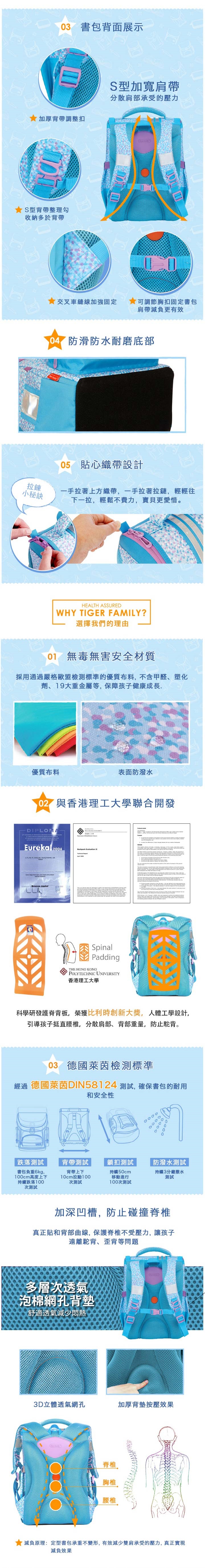 商品規格 品牌 : TigerFamily 適用性別 : 女童 包款 : 後背包 背法 : 肩背 功能/特色 : 護脊 顏色 : 藍色系 風格元素 : 特殊造型 內部夾層 : 3 內袋數 : 3 側袋 : 有側袋 尺寸 : 39X31X23cm 材質 : 容量:18L 適用學齡 : 國小 產地 : 中國 備註 : < 此款適合三~五年級學童 建議身高130cm-150cm> 體驗說明 使用方法說明 - 注意事項 ■書包清潔 ①一般髒污時,請以柔軟棉布沾攝氏40度以下水溫的清水局部擦拭乾淨,於通風陰涼處晾乾。 ②較嚴重髒污時,取少量的中性清潔劑及攝氏40度以下水溫的清水,於髒污較嚴重的地方以柔軟棉布加強擦拭、輕揉。 ③清水洗淨後,於通風陰涼處晾乾。 ■為延長書包的使用壽命,清潔時務必注意 *請勿浸泡洗滌,髒汙處局部清洗即可。 *請勿使用洗衣機、烘乾設備(例:熨斗或烘乾機)或洗衣刷。 *請勿使用漂白劑與衣物柔軟精,以避免破壞產品表面防潑水特性。 ■商品圖檔顏色因電腦螢幕設定差異會略有不同,照片僅供參考,以實際商品顏色為準。