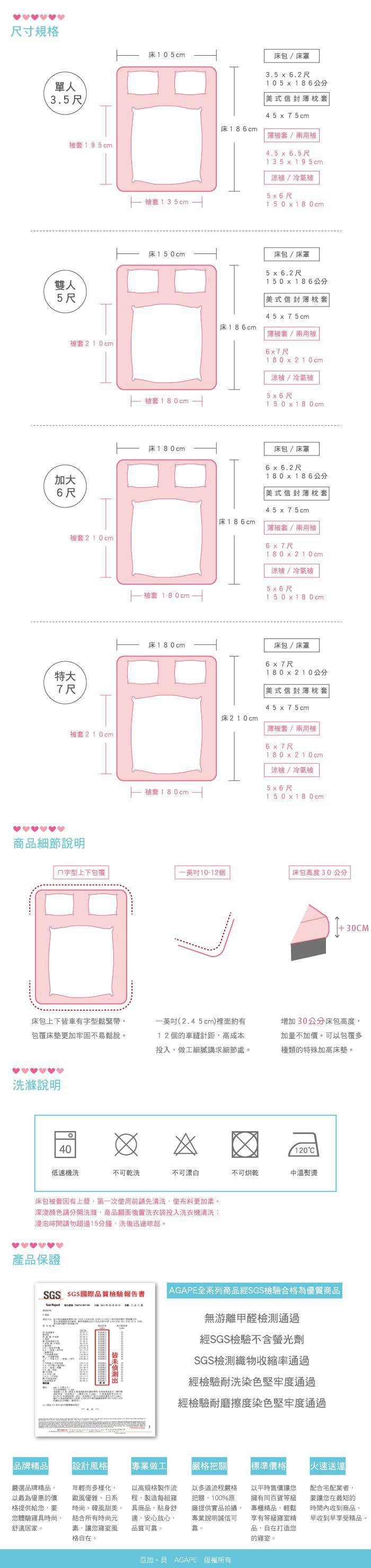 商品規格 種類 : 床罩 類型 : 兩用被床罩組 規格 : 雙人 主材質 : 天絲 材質說明 : 材質─表布:100%天絲木漿纖維布(TENCEL),SGS認證 鋪棉:100% Polyester 品牌 : AGAPE亞加‧貝 功能 : 抗菌, 透氣, 吸濕排汗 組合件數 : 8件組 枕套尺寸 : 歐式壓框鋪棉枕套×2 -(75x45公分) 薄枕套×2-(75x45公分) 被套尺寸 : 雙人兩用被套x1-6x7尺(180x210公分) 床罩尺寸 : 雙人鋪棉床罩x1-5x6.2尺(150x186公分), 可包覆35±3CM以下床墊 床墊套尺寸 : 無 產地 : 中國 備註 : 小抱枕套*1+小抱枕芯*1 體驗說明 使用方法說明 無 注意事項 【清潔保養說明】 *可水洗/不可烘乾/不可漂白/浸泡時間請勿超過20分鐘 *由於為純天然纖維,洗滌時禁止使用有關增艷之氧化劑(可使更鮮豔的添加物)、專用蛋白質洗潔劑(專洗生物蛋白質)或是含氯漂白劑(專洗白色衣物) ◆注意事項: *本商品為個人衛生用品,如商品如經拆封、使用、下水、或拆解以致缺乏完整性及失去再販售價值時,恕無法退貨! 顏色:如圖。(商品顏色僅供參考,色樣會因電腦螢幕設定不同而有誤差,顏色以實際商品為主 ) ※網頁圖片僅為示意圖參考,不含拍攝道具,實際出貨件數以「內容件數」說明為主。