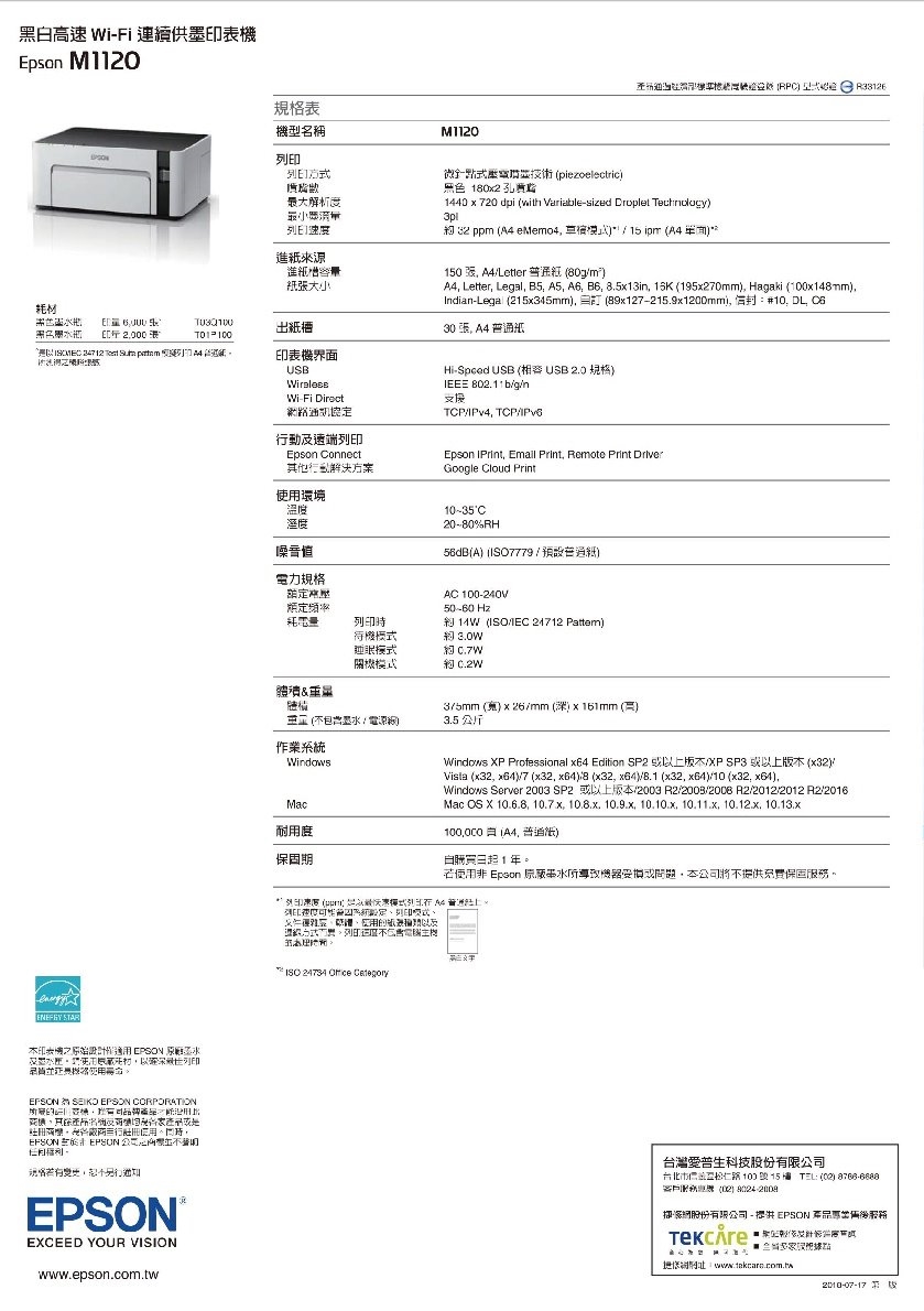 商品規格 商品名稱 : EPSON M1120 高速 Wi-Fi 黑白 連續供墨印表機 品牌 : EPSON 型號 : M1120 機種 : 噴墨印表機 產品功能 : WIFI無線, 列印 列印顏色 : 黑白 機器顏色 : 白色系 可列印紙張尺寸 : A4 列印速度 : 15ipm 列印解析度(dpi) : 1440x720 dpi 每月列印量 : * 適用墨水(碳粉)型號 : T03Q100(印量6000張) T01P100(印量2000張) 輸入介面 : USB, Wifi 額定電壓 : * 額定頻率 : * 尺寸 : 375mm (寬) x 267mm (深) x 161mm (高) 重量 : 3.5 公斤 適用作業系統 : MAC, Windows 保固 : * BSMI證號 : * 注意事項 : 以上資料與圖片僅供參考!規格及隨機標準配備以實際出貨為主,如有錯誤或不符者,將不再另行補寄或更換,謝謝! 體驗說明 使用方法說明 請參閱原廠公告說明 注意事項 ■依照消費者保護法規定,消費者均享有商品到貨七天猶豫鑑賞期之權益(但鑑賞期並非試用期)。 ■如需辦理商品退貨,商品必須是全新狀態、包裝須完整(商品主體、附件、內外包裝、廠商紙箱及所附資料之完整),否則恕不接受辦理退訂。 ■耗材類一經拆封使用,除產品本身瑕疵,恕無法辦理退貨。 ■非商品本身瑕疵辦理退貨,需由消費者將欲退貨商品和發票自行寄回本公司,本公司將不再負擔退回之運費和匯款匯費,敬請見諒。 ■傳真機/印表機內所附耗材,耗材一經拆封使用,除產品本身瑕疵,恕無法辦理退貨。若仍須辦理退貨,則需扣除耗材費用! ■產品圖片與實品會有些許色差,請依實際出貨為主。 ■以上規格資料請以原廠所公佈資料為準。
