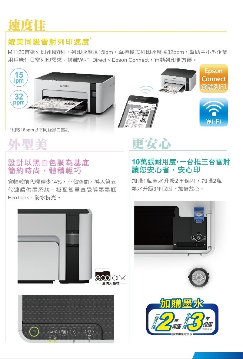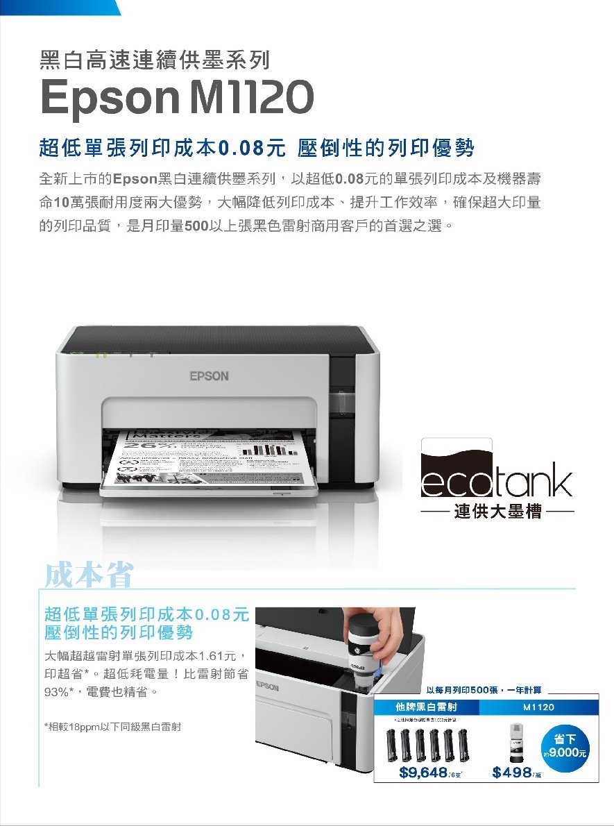 省黑色防水印量6 000張 單張列印成本0 08元起 快媲美同級雷射速度 操作更直覺 美外型再進化 體積更輕巧 商品名稱 EPSONM1120高速Wi Fi黑白連續供墨印表機品牌 EPSON型號 售價:4990