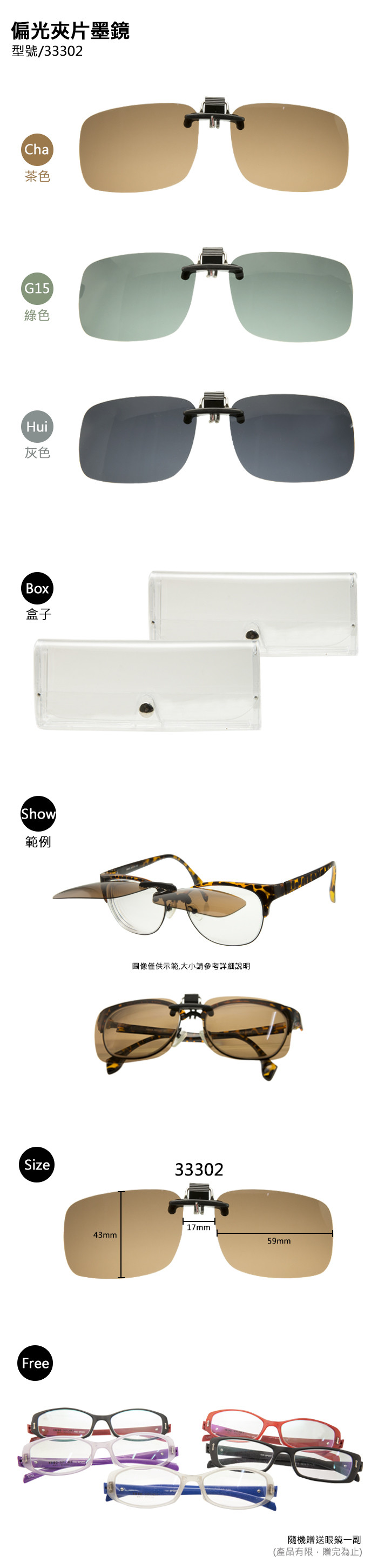 商品規格 品牌: Lover 編號規則: 33302-CHA-59-17-43 33302-G15-59-17-43 33302-HUI-59-17-43 商品型號-色號-鏡寬-鼻樑寬-鏡高 體驗說明 使用方法說明 鏡片附有黏膜貼紙,使用前請先撕除處理 注意事項 1.附贈商品中關於標籤貼紙,請保持完整原型,如有損毀及遺失,恕不接受退換貨 2.商品照片因電腦設定稍有部分色差,請以實際商品顏色為準。 3.如收到商品後發現非人為因素造成商品損毀、刮傷、或運輸過程造成包裝破損不完整,請儘速通知客服人員,我們會進行商品瑕疵鑑定,並儘速將新品寄送給您。 4.退回的商品必須是全新狀態(包括外包裝與所有內容物);所有附品鏡盒、鏡布污損,恕不接受退換貨,請多留意,以保障雙方權益。