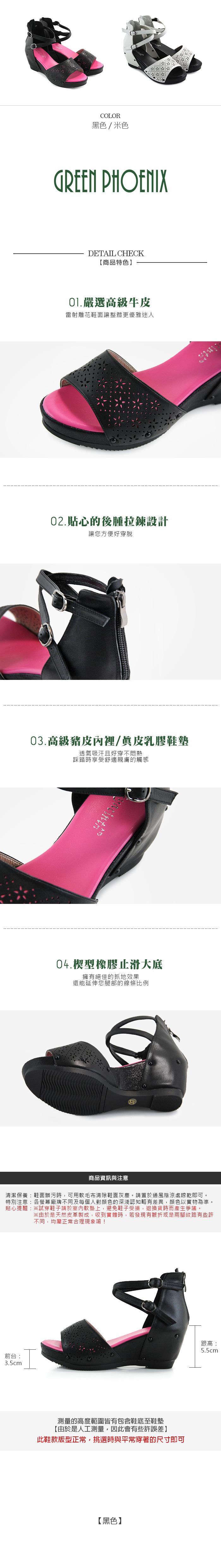 雷射雕花鞋面讓整體更優雅迷人 拉鍊設計 讓您方便好穿脫 楔型底台 延伸您腿部的線條比例 定位 專櫃品牌品牌 GREENPHOENIX波兒德適用性別 女生種類 涼鞋款式 一字尺寸 22 售價:1980