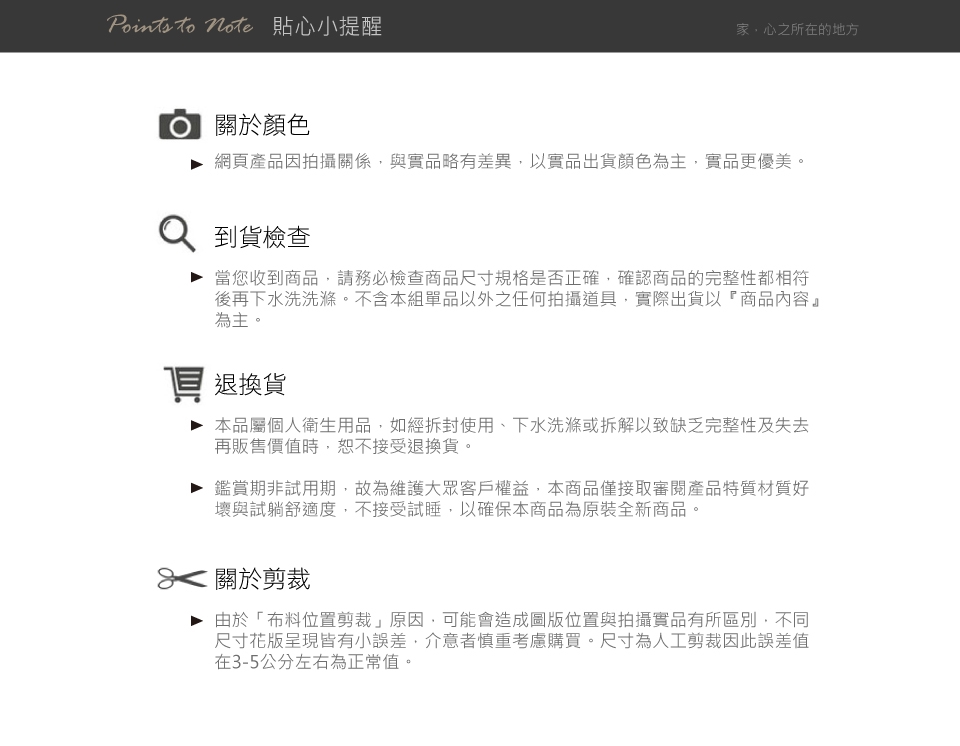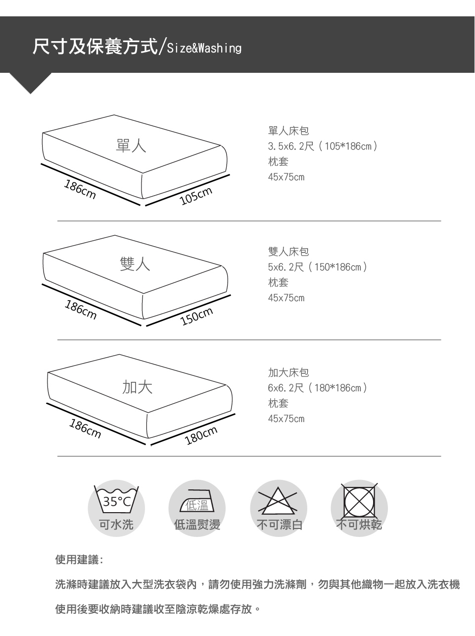 商品規格 種類 : 床包 類型 : 兩用被床包組 規格 : 雙人加大 主材質 : 天絲 材質說明 : 材質─ 100%萊賽爾纖維(天絲) 填充物─100%聚酯纖維 功能 : 恆溫 , 抗菌 流行元素 : 條紋 件數 : 4件 枕套尺寸 : 45x75公分 被套尺寸 : 6x7尺(180x210公分) 床包尺寸 : 6x6.2尺(180x186公分)/可包覆床墊高度:約35公分 體驗說明 使用方法說明 無 注意事項 .請注意:由於「布料位置剪裁」原因,可能會造成圖版位置與拍攝實品有所區別。 .顏色:如產品圖示,網頁圖片因拍攝關係,與實品略有差異,實品顏色更佳以出貨為主 .網路商品圖為參考用之情境圖示,產品內容以規格敘述內容為準 .洗滌方式:可水洗(40度C以下水溫)/不可漂白/不可烘乾/專業乾洗/低溫熨燙(110度C以下) .退換貨注意事項:退貨的商品必須必須回復原狀,亦即必須回復至您收到商品時的原始狀態(包含圖片、床包、床罩、枕頭被套、內外包裝、贈品、活動贈品等 ) .下列情形可能影響您的退貨權限: 1.本賣場商品屬於「個人衛生用品」,基於個人衛生 僅接取審閱產品特質、材質好壞與試躺舒適度,如商品因試睡、洗滌等等...產生異味與明顯使用痕跡 恕不接受退換貨。 2.在不影響您檢查商品情形下,您將商品外包裝毀損、封條移除、吊牌拆除、貼膠移除或標籤拆除等情形 恕不接受退換貨。 3.在您收到商品之前,已提供您檢查商品之機會 如有損壞 恕不接受退換貨。 4.其他逾越檢查之必要或可歸責於您之事由,致商品有毀損、滅失或變更者 恕不接受退換貨。