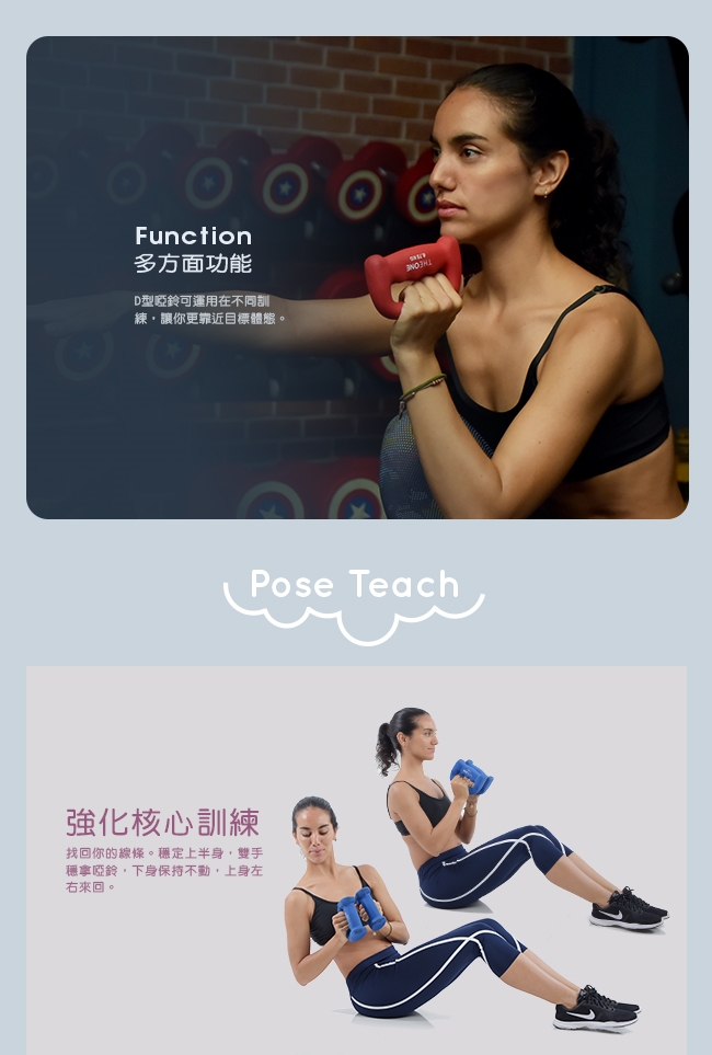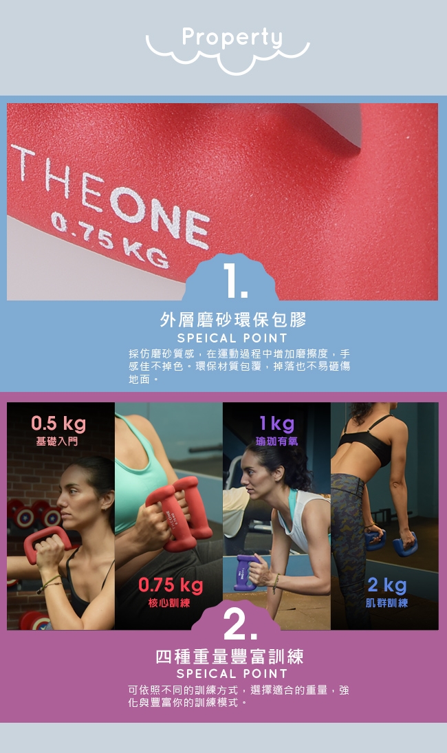 符合手掌弧度 舒適好握 提昇瑜珈強度 強化肌力 四種重量可選 配合訓練需求 品牌 THEONE訓練部位 手臂 背部 核心肌群類別 無氧運動無氧運動 啞鈴特色 磨砂質感 手感極佳 售價:424