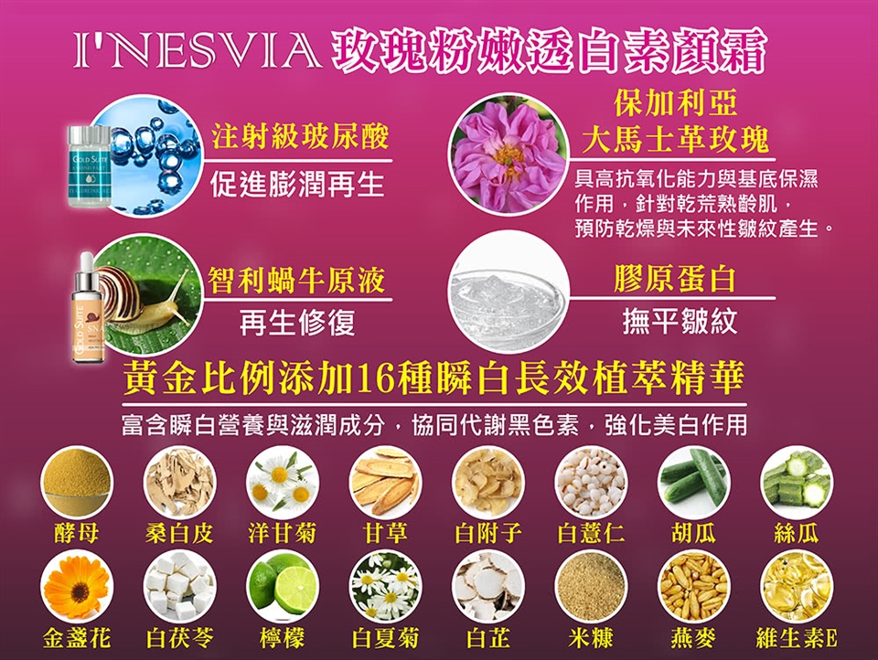 不用卸妝的保養品 打造素顏女神真裸妝 品牌 I NESVIA品類 日霜 晚霜功能 保濕 滋潤適用部位 臉部適用膚質 全膚質規格 容量 I NESVIA玫瑰粉嫩透白素顏霜50mlx3入體驗 不開 售價:399