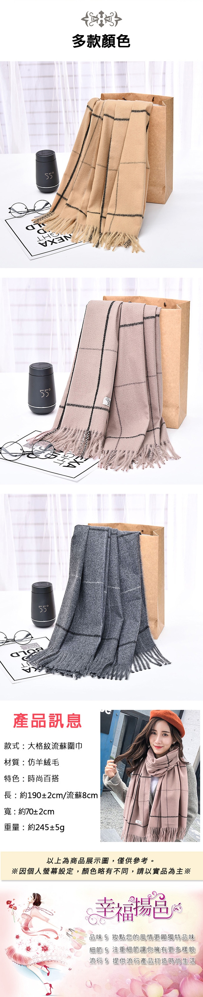 大格紋百搭款 纖細流蘇設計 圍巾披風兩用 品牌定位 流行品牌品牌 幸福揚邑類型 圍巾材質 羊絨材質說明 形狀 長方形圖案 大格紋材質 仿羊絨尺寸 長度 約200x70cm 含流蘇 售價:499